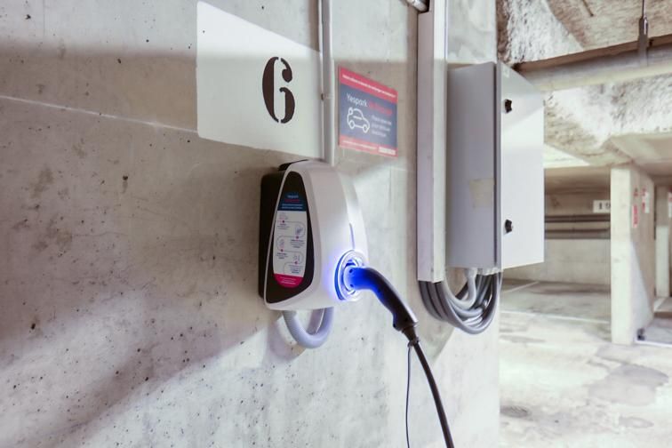Auf diesem Parkplatz stehen Ladestationen zur Verfügung.